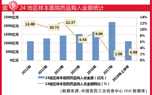 由于医院控费(医院用药与医保用药总量控制)等重要因素,24地区样本医院药品购入金额在2018年上半年同比增长出现近5年中首次低于1%。按此趋势发展,如果2018下半年未有明显发力因素出现,2018年全年增速将再创新低。