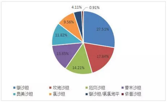 其中,缬沙坦、坎地沙坦、厄贝沙坦、氯沙坦和奥美沙坦共占据沙坦类药物近81%的市场份额。