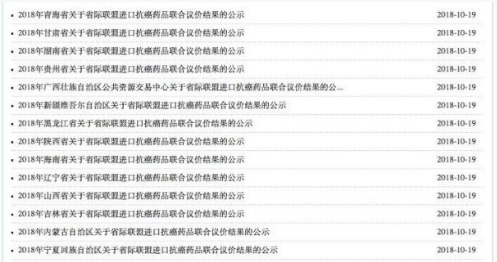 10月19日,陕西、内蒙古、宁夏、甘肃、青海、新疆、湖南、黑龙江、辽宁、广西、贵州、海南、山西、吉林14省药采平台同时发布《关于省际联盟进口抗癌药品联合议价结果的公示》。