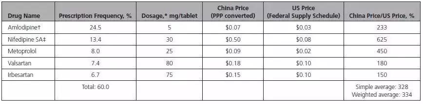 文章比较了中国和美国的常用降压药的价格,重点研究了中国基层医疗服务中处方频率>5%的5种降压药(即氨氯地平、硝苯地平、美托洛尔、缬沙坦和厄贝沙坦)。