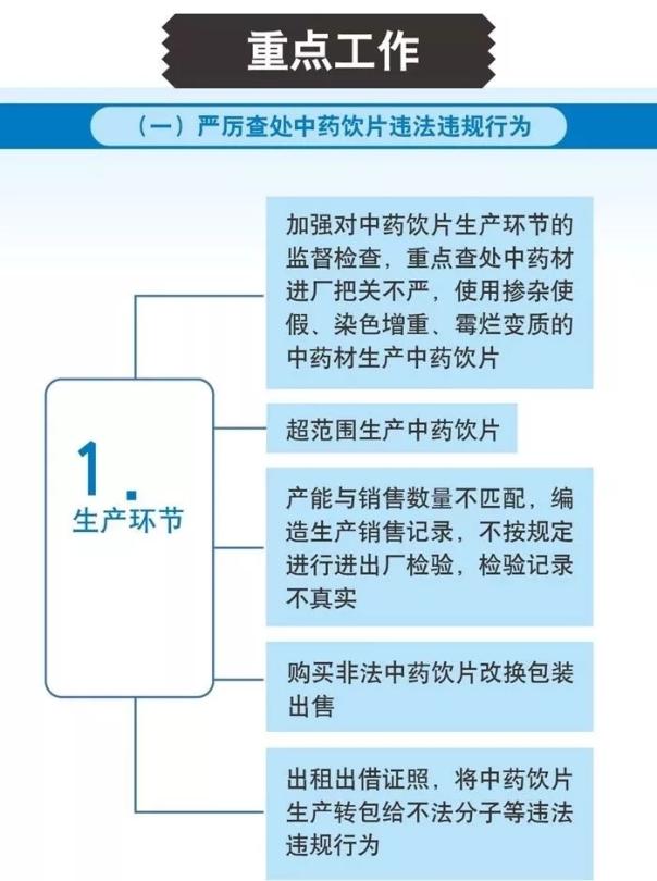 图解中,相关部门将加强对中药饮片生产环节的监督检查,重点查处中药材进厂把关不严,使用掺杂使假、染色增重、霉烂变质的中药材生产中药饮片。