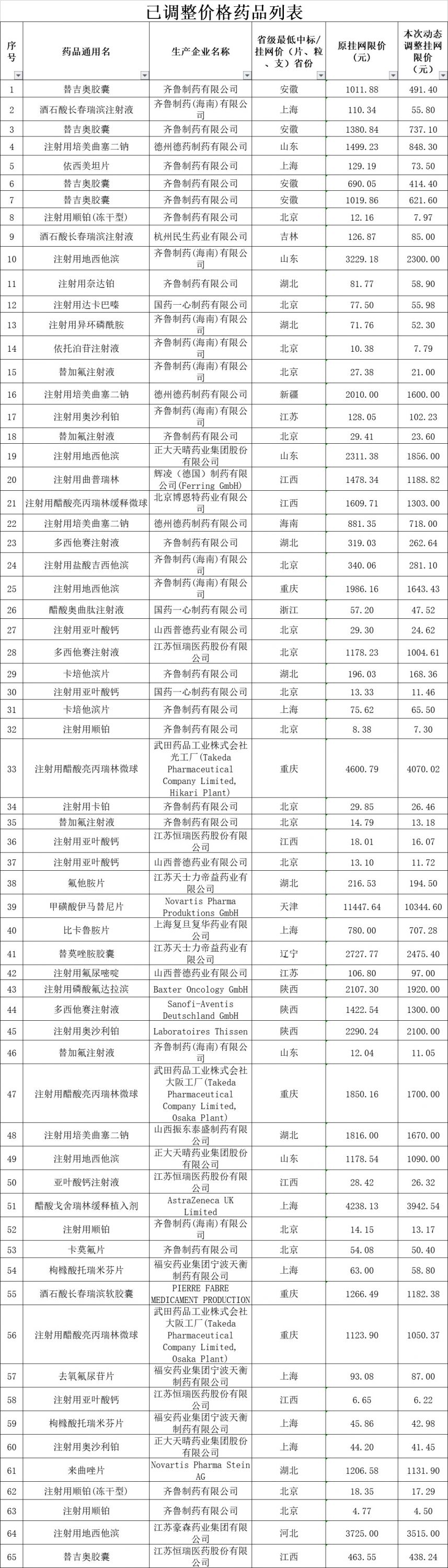 据通知,根据四川省卫生和计划生育委员会《关于印发<2018年度四川省抗癌药专项集中采购实施方案>的通知》(川卫函〔2018〕229号)、《关于开展2018年度四川省抗癌药增补工作的通知》(川药械采〔2018〕187号)和《关于开展2018年度四川省抗癌药最高挂网限价动态调整的通知》(川药械采〔2018〕205号)相关要求,按照企业填报的最新省级最低价,对替吉奥胶囊等111个药品的中标/挂网价予以动态调整。