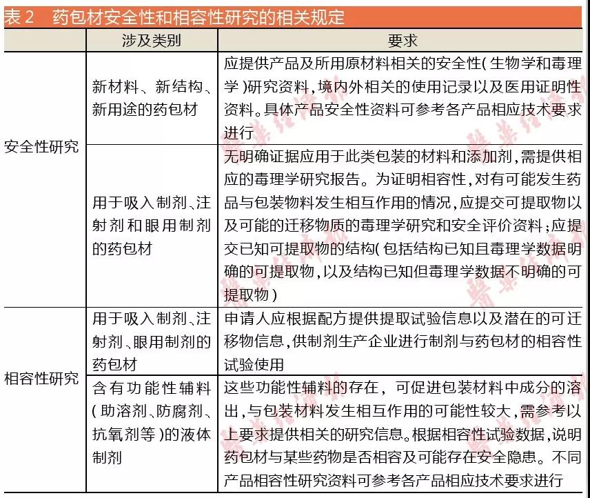 2016年第155号文对药包材申报资料要求(试行)中,对药包材安全性和相容性研究的要求见表2。