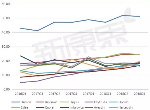 赫赛汀是一种靶向于人表皮生长因子受体(HER2)的人源化单克隆抗体。HER受体通过感受外界的信号刺激促进细胞的增殖,在相当一部分的癌细胞中HER2过表达导致细胞生长失控。赫赛汀早在1998年就被FDA批准上市,是最早的靶向治疗药物之一,目前已经是治疗HER2阳性弥散性乳腺癌的黄金标准,近期又被批准用于治疗HER2受体为阳性的转移性胃癌上。此药的专利已经在2015年到期,目前已经有四个生物类似药物上市:分别是辉瑞的Trazimera,Celltrion公司的Herzuma,Bioepis公司的Ontruzant、Mylan和Biocon的Ogivri,但是从近几个季度的销售额来看,赫赛汀似乎没有受到太大的影响,2018年Q3销售额达到16.35亿美元,较去年同期有所增长。这可能是两方面的因素,一方面赫赛汀早已畅销全球,这几种仿制药只是在局部地区获批上市,赫赛汀还占据着绝对的优势;另一方面生物类似药物和化学仿制药物还是有区别的,由于生物药结构更为复杂,类似药往往达不到原研药的药效,尽管如此,赫赛汀的市场受类似药慢慢蚕食已经是不可阻挡的趋势,明年或许是它最后一次排在TOP10榜单中,预测2019年销售额65.99亿美元。