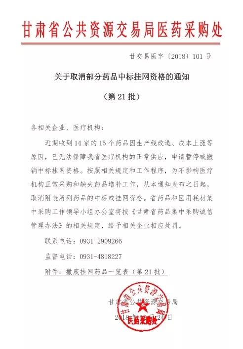 据通知,15个药品即日起被取消挂网资格,省药品医用耗材和药品采购工作领导小组办公室将按《甘肃省药品集中采购诚信管理办法》的相关规定,给予相关药企惩罚。