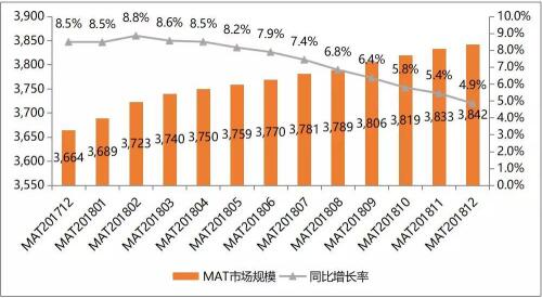 2) 同比增长率为与上一年度的同比增长,MAT201802较MAT201702增长率为8.8%。