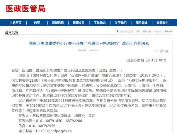 动脉网获悉,为规范“互联网+护理服务”,保障医疗质量和安全,助力实施健康中国战略,国家卫生健康委办公厅在12日发布《关于开展“互联网+护理服务”试点工作的通知》(以下简称“《通知》”),《通知》确定北京市、天津市、上海市、江苏省、浙江省、广东省六大省市作为“互联网+护理服务”试点省份。允许其他省份结合本地区实际情况选取试点城市或地区开展试点工作。并发布具体试点工作方案,要求各省市结合实际制订实施方案。