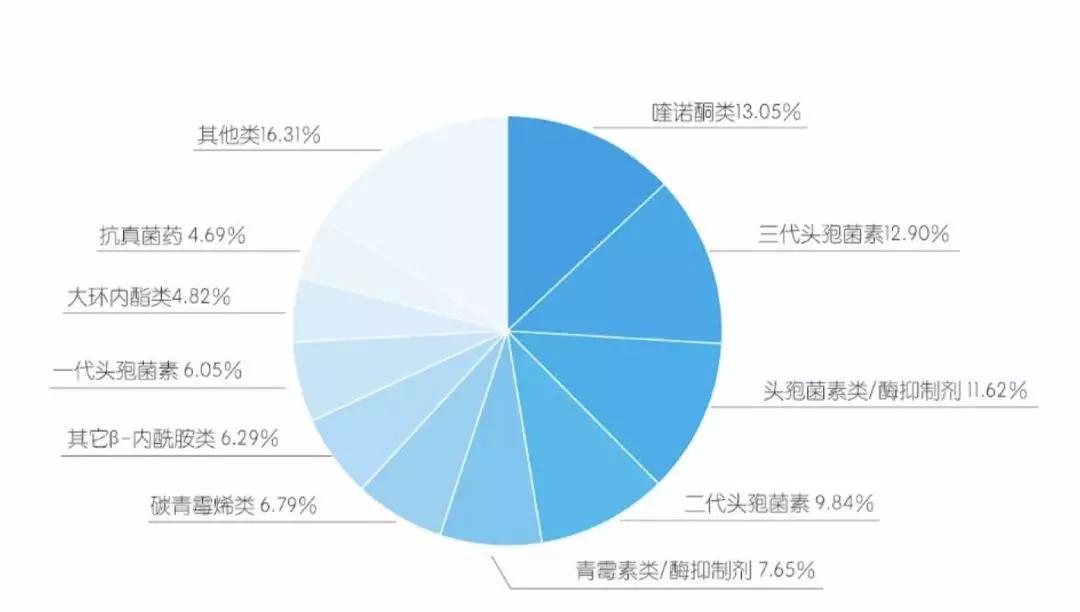 据报告,2017年抗菌药物消耗量排名前五为喹诺酮类药物(13.05%)、三代头孢菌素(12.90%)、头孢菌素/酶抑制剂(11.62%)、二代头孢菌素(9.84%)和和青霉素类酶抑制剂(7.65%)。