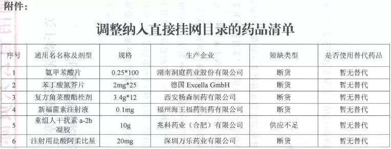 根据通知,这6个药品被列入《湖南省2018年医疗机构短缺药品清单》,由于临床暂无替代,目前处于断货或供应不足的状态,且短期无法恢复供应,现取消这6个药品的原挂网价格,纳入直接挂挂网目录,由医疗机构和药企直接议价采购。
