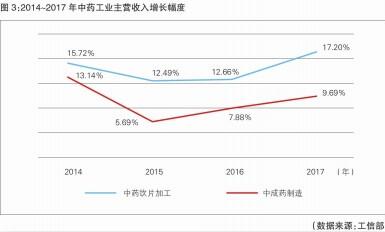 中药饮片需求高速增长。工信部发布的数据显示,2014~2017年,中成药制造业主营业务收入平均增速只有9.1%;而同时期,中药饮片工业的增速高达14.52%(见图3)。据统计,2018年中药饮片板块增加的需求量可直接拉动原药材销售量增长20万吨,销售额在76亿元左右。