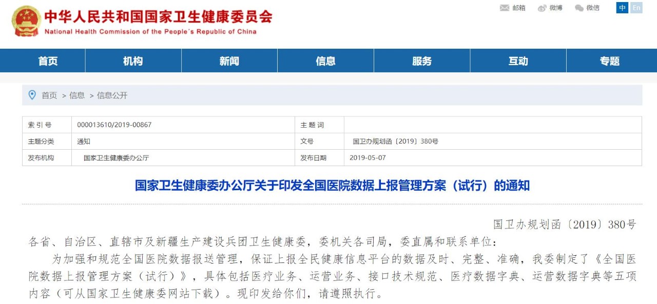 医药网5月9日讯 5月7日,国家卫健委官网发布《国家卫生健康委办公厅关于印发全国医院数据上报管理方案(试行)的通知》和《国家卫生健康委办公厅关于印发全国医院上报数据统计分析指标集(试行)的通知》(以下简称《通知》),旨在加强和规范全国医院数据报送管理,提升医疗机构上报数据的分析和应用质量,建立医院上报数据的标准化分析指标体系。
