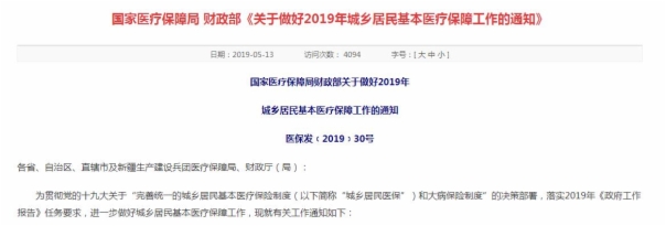 医药网5月15日讯 为贯彻落实2019年《政府工作报告》任务要求,全面推进完善统一的城乡居民基本医疗保险和大病保险制度,近日,国家医疗保障局会同财政部印发了《关于做好2019年城乡居民基本医疗保障工作的通知》(医保发﹝2019﹞30号)。内容涉及提高城乡居民医保和大病保险筹资标准、全面建立统一的城乡居民医保制度、完善规范大病保险政策和管理等内容。