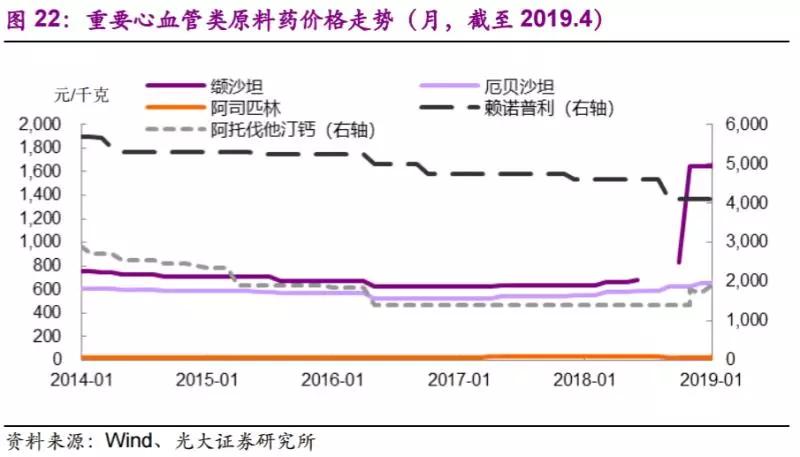 据光大证券消息,截至2019年4月,缬沙坦报1950元/kg,本月继续上涨 11.43%,价格创过去 10年来新高。