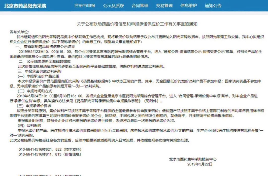 按照北京阳光采购平台通知,企业申报时间是从明天(5月24日)到5月30日,在截止日前,企业可以修改承诺价,以最后一次提交为准。根据此前北京规定,如果企业提供不实价格或应提供而未提供客观的价格,则面临纳入质量信誉档案风险。这也意味着,如果不想失去北京甚至更大市场,还是尽快如实填写为好。