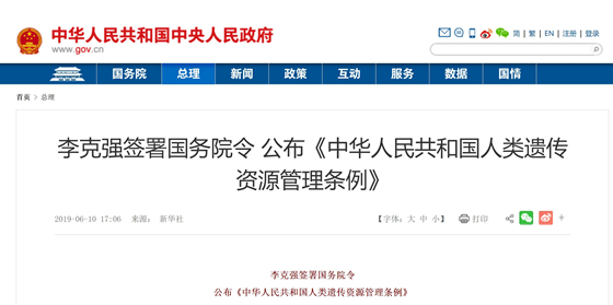医药网6月12日讯 据新华社消息,日前,国务院总理李克强签署国务院令,公布《中华人民共和国人类遗传资源管理条例》(以下简称《条例》),自2019年7月1日起施行。