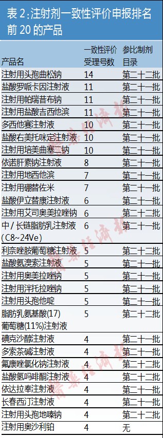 如表2所示,第二十一批和第二十二批名单的产品,基本涵括了一致性评价申报排名前列的产品。这意味着一旦注射剂一致性评价启动,申报生产厂家数较多的产品将会很快达到3家,而这又意味着未过一致性评价的产品将要失去医疗机构的市场。