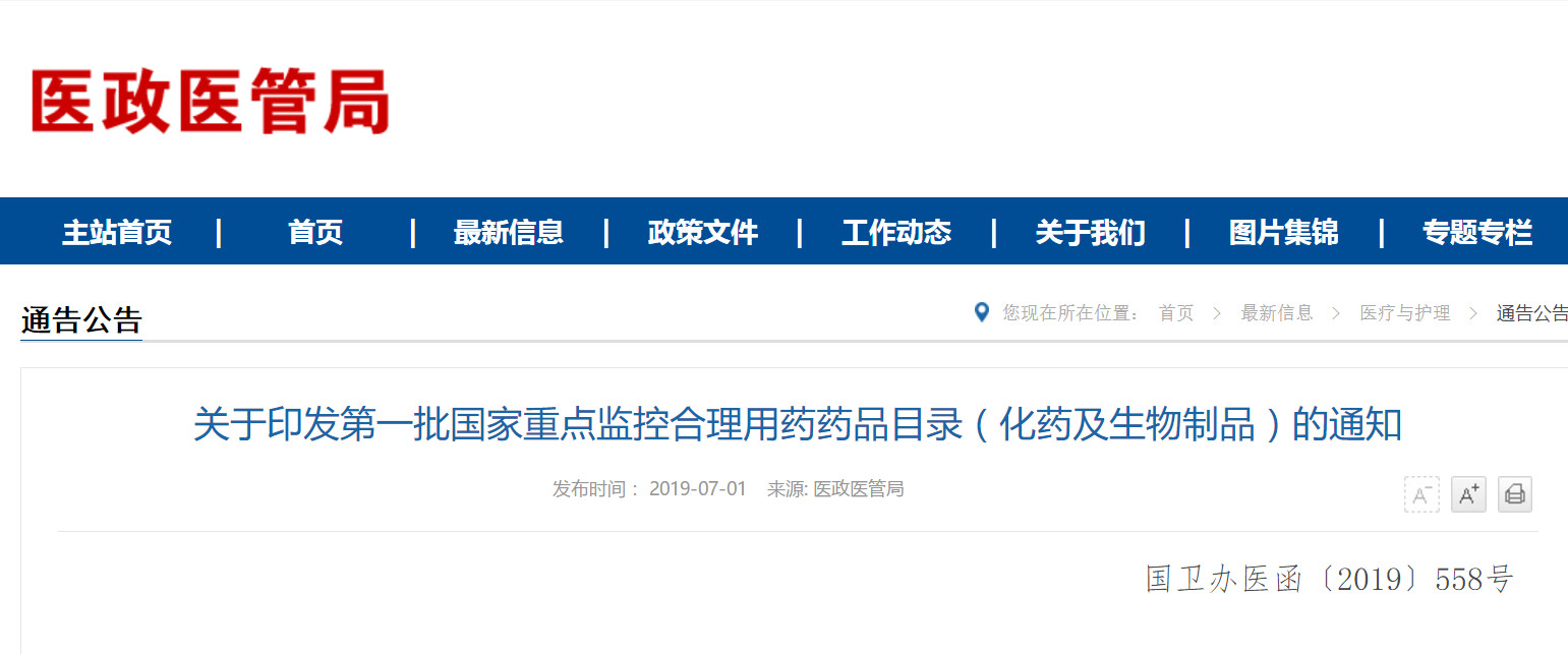 7月1日下午,国家卫健委医政医管局发布了“关于印发第一批国家重点监控合理用药药品目录(化药及生物制品)的通知”。