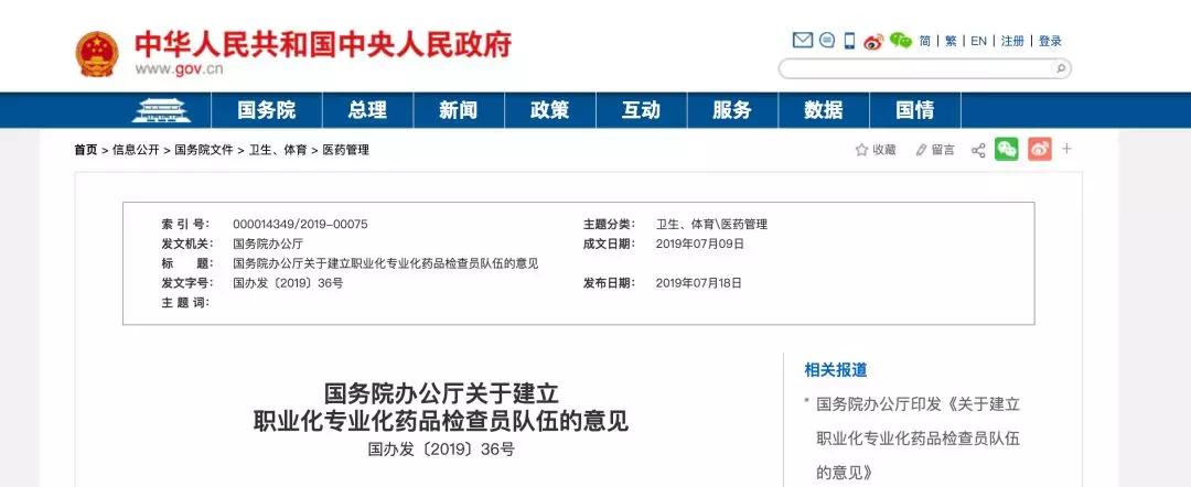7月18日,国务院办公厅发布文件《关于建立职业化专业化药品药品检查员队伍的意见》(以下简称《意见》)。