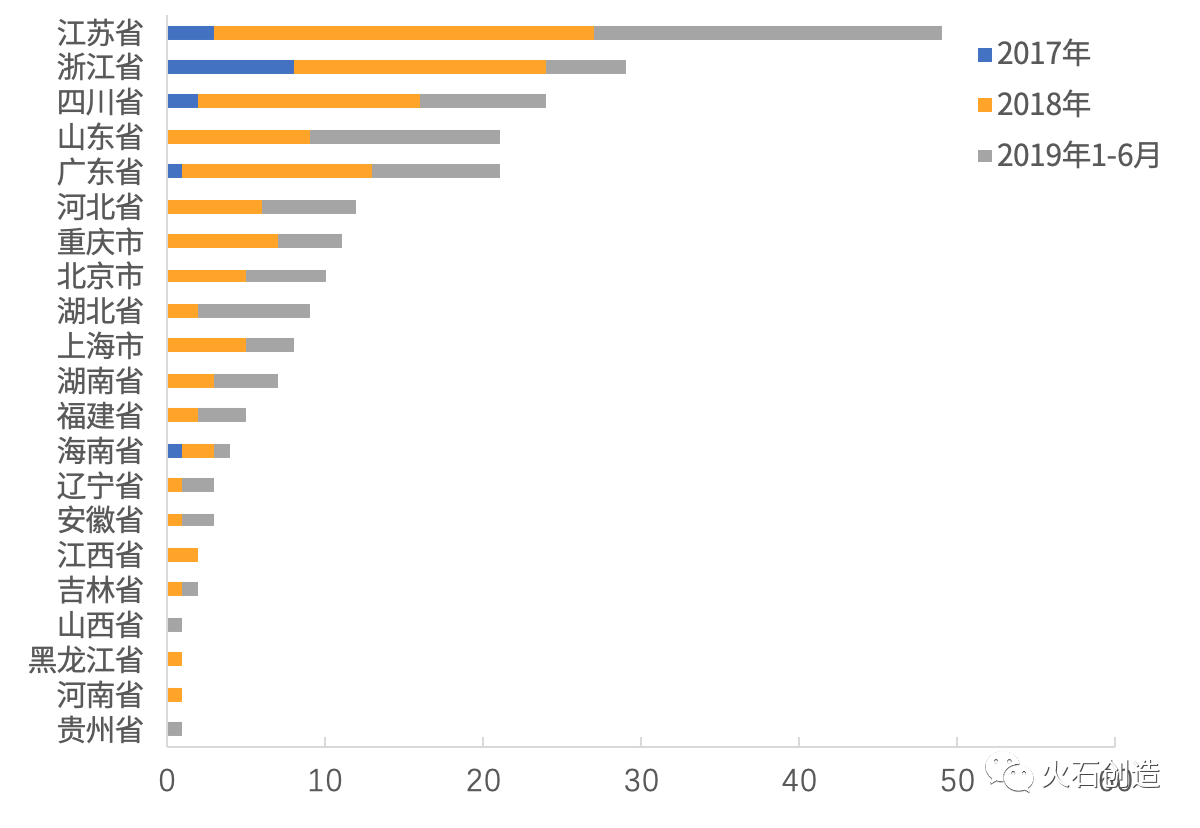 根据火石创造数据库,2017—2019年H1已有21个省份的仿制药通过一致性评价,其中江苏(49个)、浙江(29个)、四川(24个)、广东(21个)、山东(21个)等5个省份过评药品数最多,总计144个、占全国的64%。