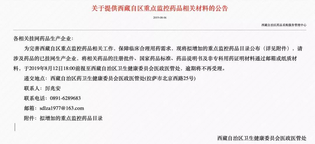 公告显示,为完善西藏自区重点监控药品相关工作,保障临床合理用药需求,现将拟增加的重点监控药品目录公布,请涉及药品的已挂网生产企业,将相关药品的注册批件、国家药品标准、药品说明书及非专科用药证明材料通过邮箱或纸质材料,于2019年8月12日18:00前报至西藏自治区卫生健康委员会医政医管处,逾期将不再受理。