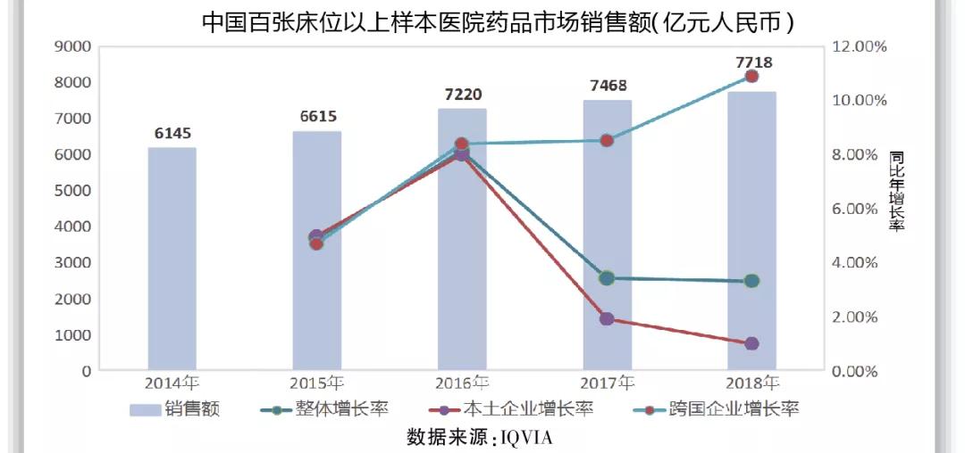 总体看,外企(进口或合资)药品销售增长2018年达10.9%,较大幅度下降的是本土企业用药,2018年同比增长仅0.8%。2019年,随着一致性评价陆续完成,临床用药监控、DRGs实施,实现市场增长极具挑战。