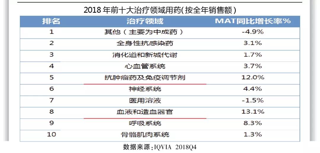 再来看具体产品品牌,2018年医院用药销售额十大品牌药中,中成药和辅助用药销售下降;立普妥已多年稳居第一,很难撼动;乳腺癌靶向治疗药赫赛汀增长达59.3%,虽然乳腺癌Her2表达患者不太多,但依从性好,服药时间长,市场没有仿制药,2018年进入大病医保,市场需求增长快。