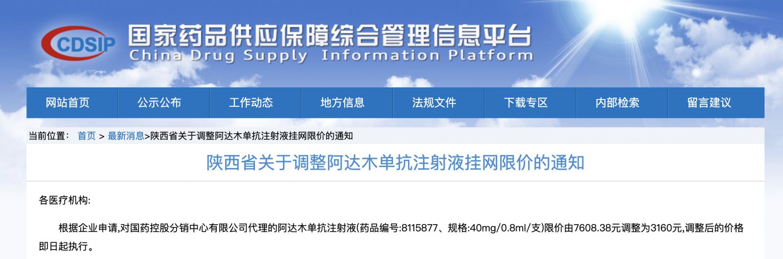 近日,陕西省发布了《关于调整阿达木单抗注射液挂网限价的通知》,宣布根据企业申请,对国药控股分销中心有限公司代理的阿达木单抗注射液(药品编号:8115877、规格:40mg/0.8ml/支)限价由7608.38元调整为3160元,调整后的价格即日起执行。