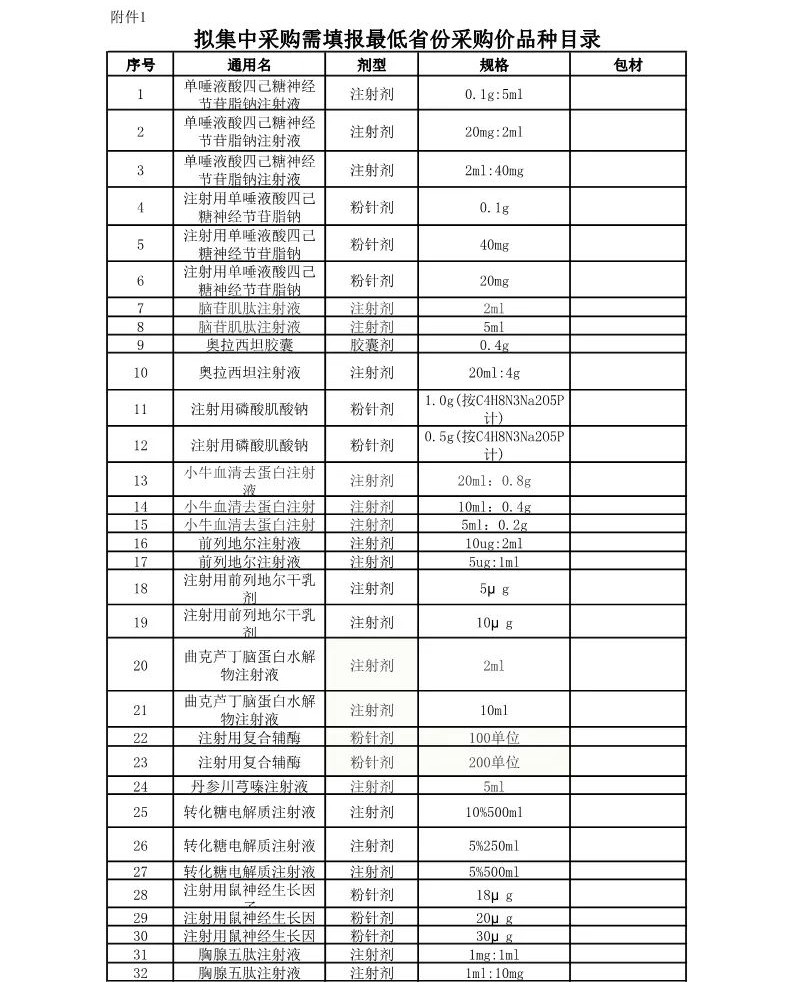 据赛柏蓝梳理,单唾液酸四己糖神经节苷脂钠注射液、奥拉西坦胶囊、脑苷肌肽注射液、注射用磷酸肌酸钠、小牛血清去蛋白注射液、前列地尔注射液、曲克芦丁脑蛋白水解物注射液、注射用复合辅酶、丹参川弓嗪注射液、转化糖电解质注射液、胸腺五肽注射液、依达拉奉注射液、长春西汀注射液、马来酸桂哌齐特注射液、氯化钠注射液、葡萄糖氯化钠注射液等药品均在采购范围内。