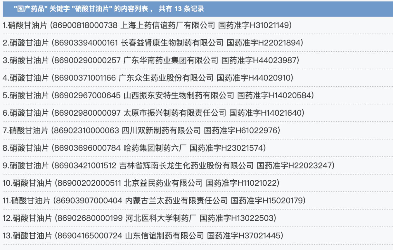 据赛柏蓝在国家药监局官网查询,目前国内“硝酸甘油片”的生产企业共有13家,振东安特是其中之一。