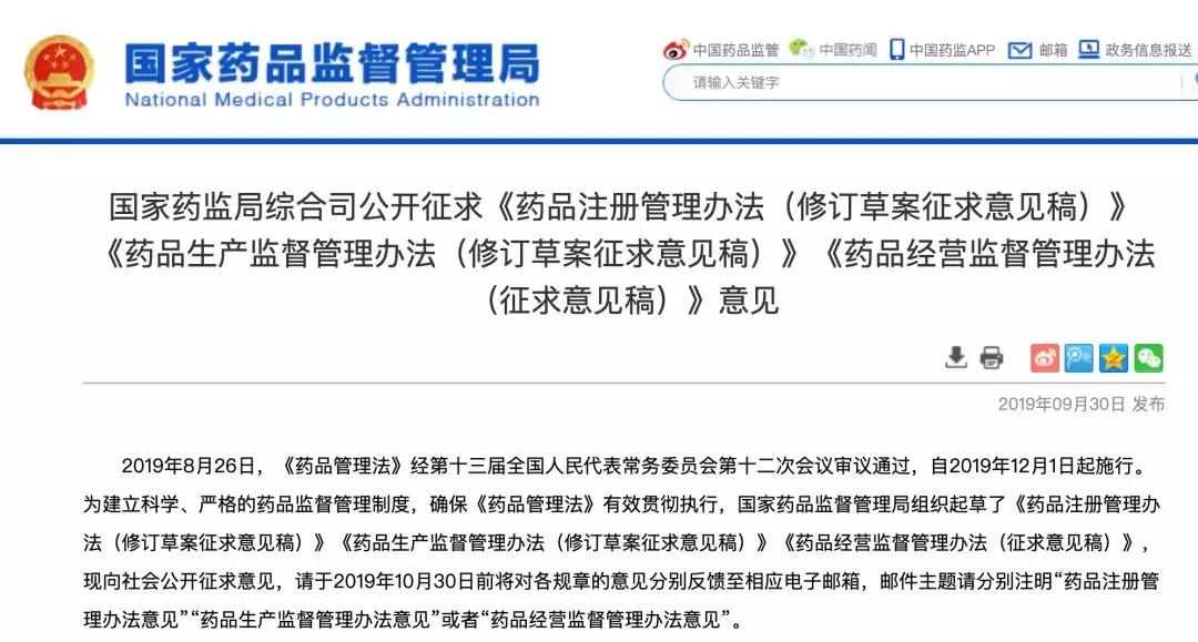 医药网10月8日讯 9月30日,国家药品监督管理局官网对药品注册、生产、经营三个规章公开征求意见。三个规章分别为:《药品注册管理办法(修订草案征求意见稿)》《药品生产监督管理办法(修订草案征求意见稿)》《药品经营监督管理办法(征求意见稿)》。