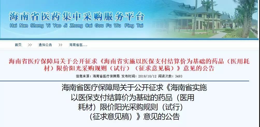 医药网10月14日讯 10月12日,海南省医药集中采购服务平台挂网《海南省医疗保障局关于公开征求<海南省实施以医保支付结算价为基础的药品(医用耗材)限价阳光采购规则(试行)(征求意见稿)>意见的公告》(下称《采购规则》),向社会征求意见及建议。