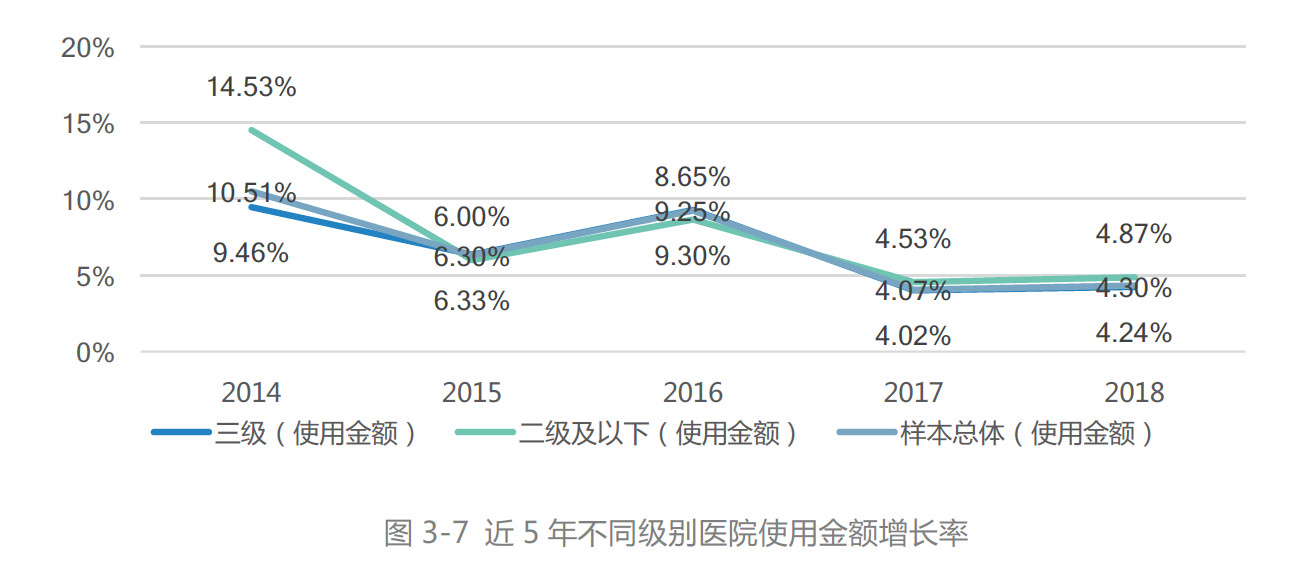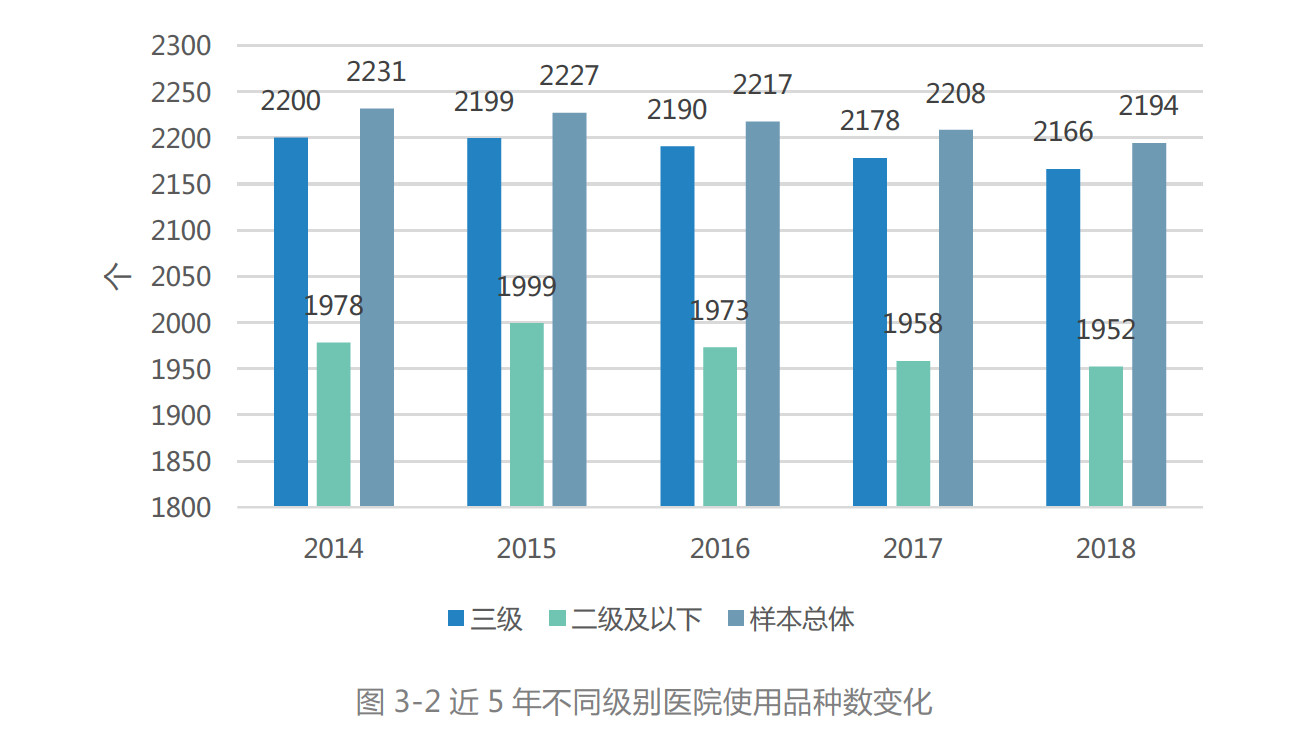 在全药使用品种数上,从《报告》给出的近五年数据来看,整体来说,医院对药品使用品种数的需求基本稳定。但值得注意的是,不同级别的医院都呈现小幅减少的趋势,样本医院总品种数从2014年的2231种减少到2018年的2194种,退出182 个品种,新增145 个品种,净减少37个品种。