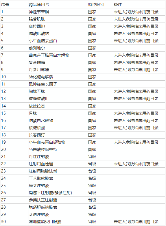 其中,国家重点监控的药品有,前列地尔、转化糖电解质、鼠神经生长因子、依达拉奉等;省级重点监控的药品有,康艾注射液、艾迪注射液、消癌平注射液(静脉注射);医院自行增补的三个药品分别是舒血宁注射液、苦碟子注射液、生脉注射液。