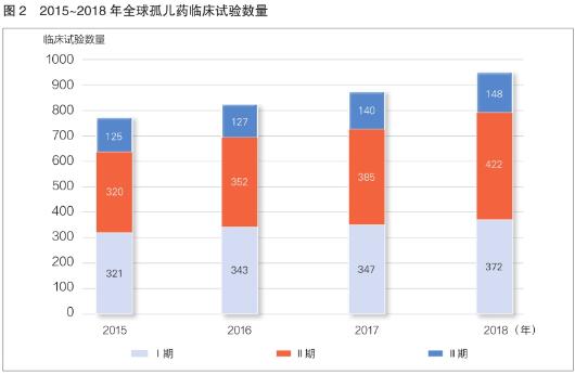 Tuf t s CSDD(塔夫茨大学药品研发中心)统计数据显示,2015年全球孤儿药的临床试验数为766个,到2018年增长到942个,年增长率为8.9%。在孤儿药的临床试验中,约84%的临床试验处于Ⅰ、Ⅱ期开发阶段。近年来,孤儿药Ⅱ、Ⅲ期临床试验的年增长率超过12%,为Ⅰ期临床试验增长率的两倍多,预示着孤儿药研发投入逐渐显现成效(见图2)。
