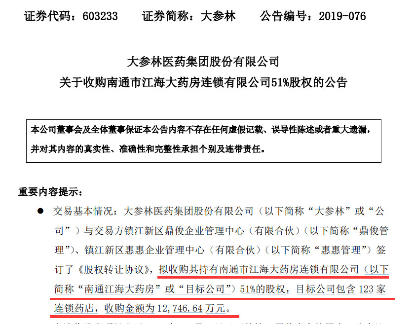 11月6日,大参林发布公告称,拟收购南通市江海大药房连锁有限公司“以下简称江海大药房”51%的股权,该公司包含123家连锁药店,收购金额为 12746.64万元。