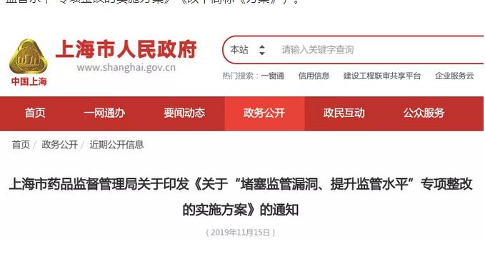 医药网11月18日讯 11月15日,上海市人民政府官网挂了一则上海市药监局《关于“堵塞监管漏洞、提升监管水平”专项整改的实施方案》《以下简称《方案》)。