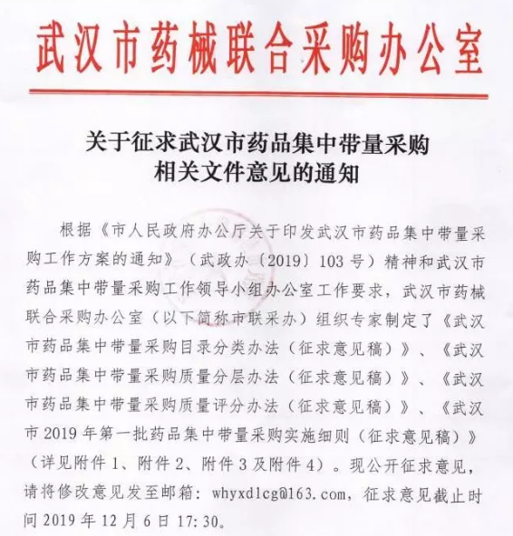 12月1日晚,带量采购模式风向标之一的武汉市下发《武汉市药品集中带量采购目录分类办法(征求意见稿)》《武汉市药品集中带量采购质量分层办法(征求意见稿)》《武汉市药品集中带量采购质量评分办法(征求意见稿)》《武汉市 2019 年第一批药品集中带量采购实施细则》4份带量采购细则,正式拉开在国家级、省级之下的市级带量采购。