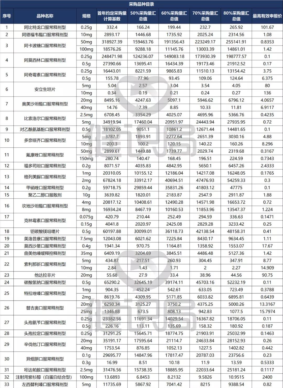 据健识局梳理发现,在此次33个带量采购的品种中,阿比特龙、阿德福韦酯、阿卡波糖、阿莫西林 、阿奇霉素 、奥美沙坦酯 、比索洛尔等均是临床常见的大品种。