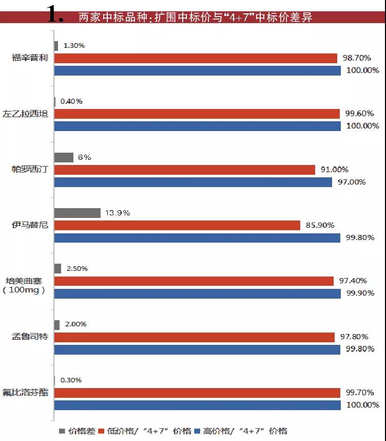 二是两家中标情况,如氟比洛芬酯、福辛普利、孟鲁司特、帕罗西汀、培美曲塞(100mg)、伊马替尼、左乙拉西坦等7种药品有两家中标。