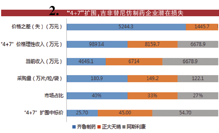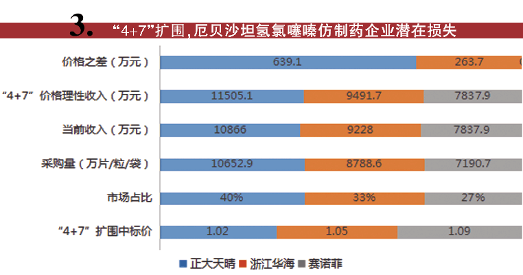 对比此次竞品数量少于三家情况,一是独家中标品种,如右美托咪定、依那普利、氯沙坦、赖诺普利,这四种产品原研药未跟进投标,因此,企业报价策略与“4+7” 价格一致。