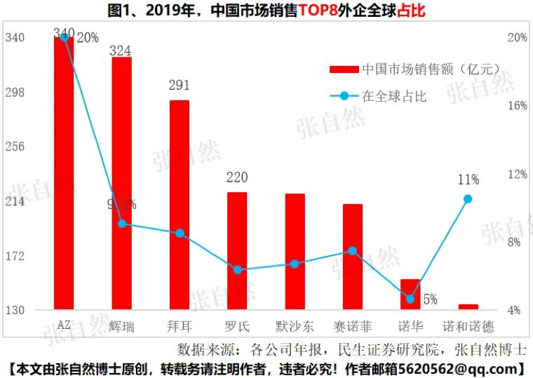 中国市场对全球业绩贡献最大的也是AZ,占其全球销售额的1/5,比2018年又提升了3个百分点;位居其后的是诺和诺德,中国销售占全球销售的11%,主要受益于利拉鲁肽和重组人凝血因子Ⅶ A进入医保后明显上量和胰岛素产品的稳健增长。(图1)