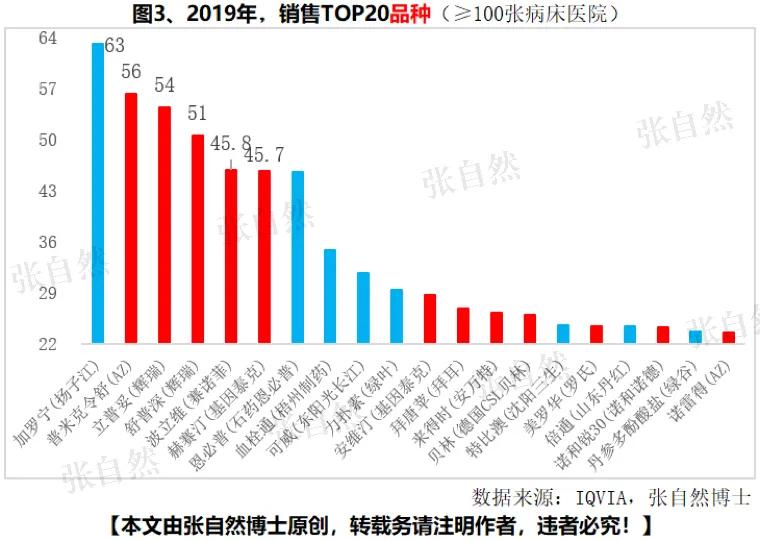 按IQVIA数据统计,2019年,在≥100张病床医院销售额TOP 20品种中,外企占了2/3(12个),除销售额最大的扬子江的加罗宁(63.09亿元)外,后面5个品种全部来自外企,分别是普米克令舒(AZ)56.2亿元、立普妥(辉瑞)54.5亿元、舒普深(辉瑞)50.5亿元、波立维(赛诺菲)45.8亿元和赫赛汀(基因泰克)45.7亿元。其中,位居第3和第4位的立普妥和舒普深都来自辉瑞,仅这两个品种就为该公司贡献了105亿元,足见原在华外企“一哥”的实力。此外,AZ和基因泰克也各有2个品种入围TOP 20。(图3)