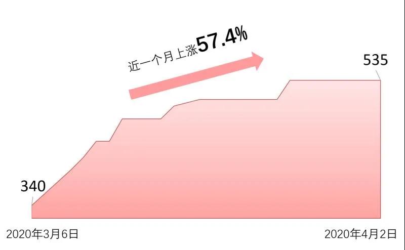 维生素A近三个月价格涨幅为74%。自3月6日起,其价格明显上涨,从340元/千克上涨至4月2日的535元/千克,近一个月的价格涨幅为57.4%。
