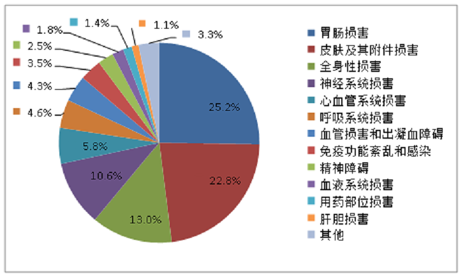 2019年报告的药品不良反应/事件中,累及器官系统排名前5位的分别为皮肤及其附件损害、胃肠损害、全身性损害、神经系统损害和心血管系统损害(图8)。